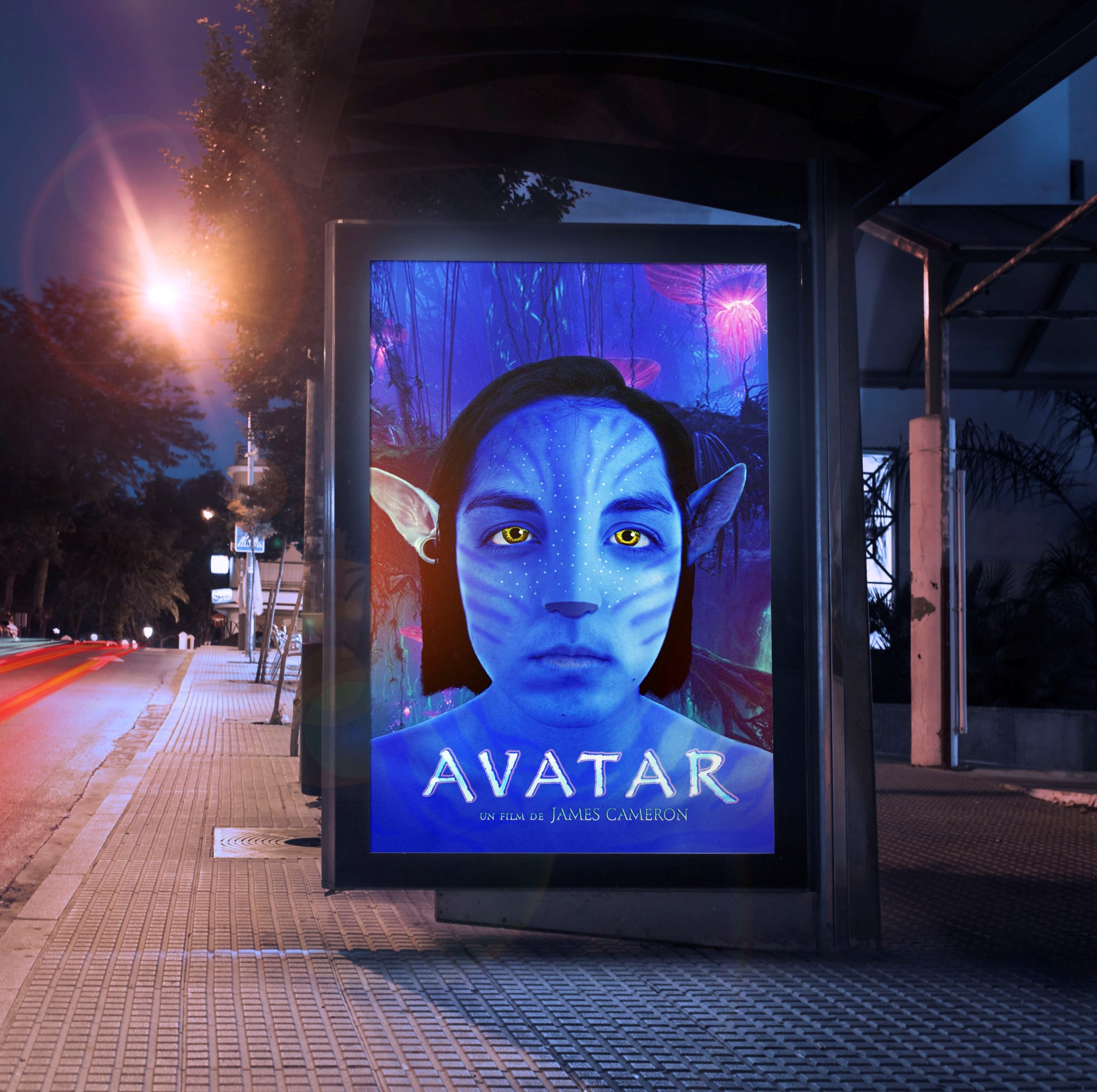 Cartel publicitario de la película “Avatar” aplicando maquillaje digital utilizando un autoretrato.